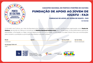 Com essa certificação, a FAJI passa a integrar oficialmente o Cadastro Nacional de Pontos e Pontões de Cultura, sendo reconhecida como uma entidade de base que desenvolve e articula atividades culturais continuadas na nossa comunidade.